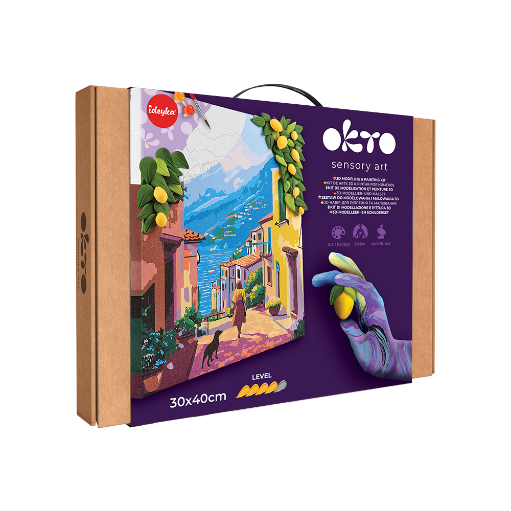 With the OKTO “Lemon Weekend” 3D modeling + painting kit, you don’t just recreate the view — you live inside it. Touch the textures of the cobbled street, sculpt bright lemons, and follow the light that dances on the lake.