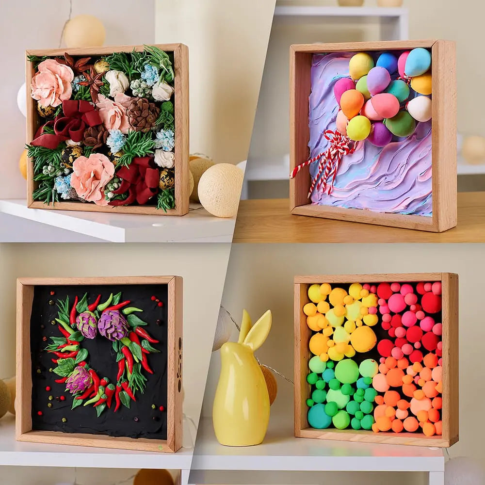 Choose the color you want to start with, pick up the clay with your fingers, and boldly apply it to the canvas. Create your background, then sculpt according to the template and transfer parts of the painting to the base. Feel how art is born under your hand.